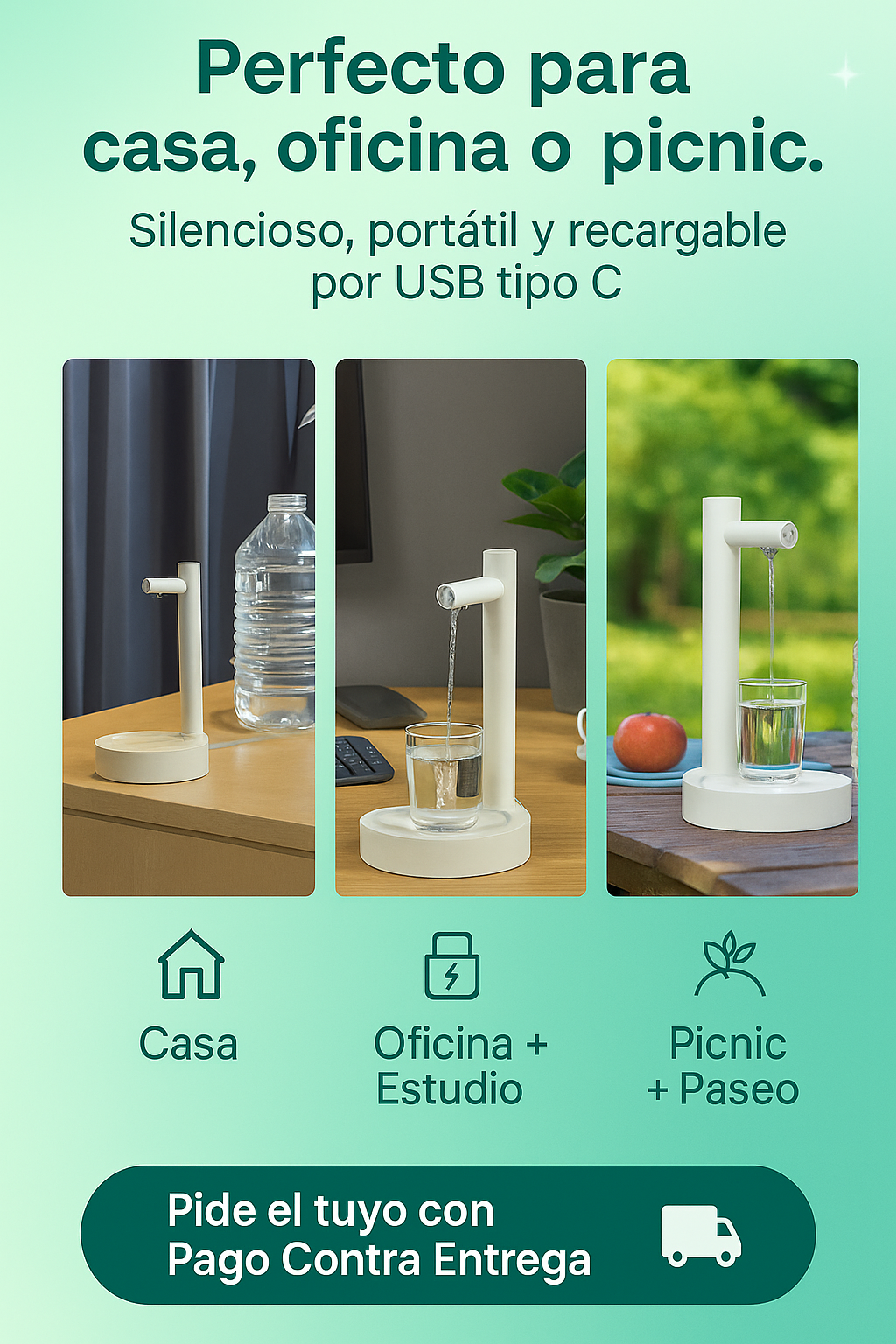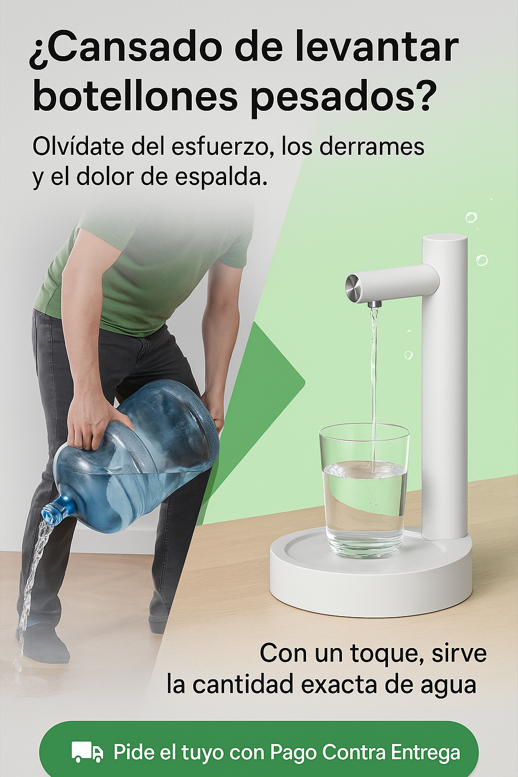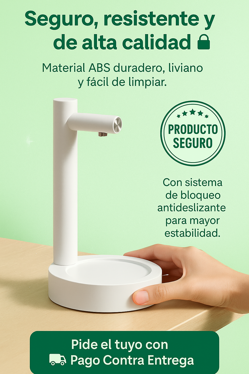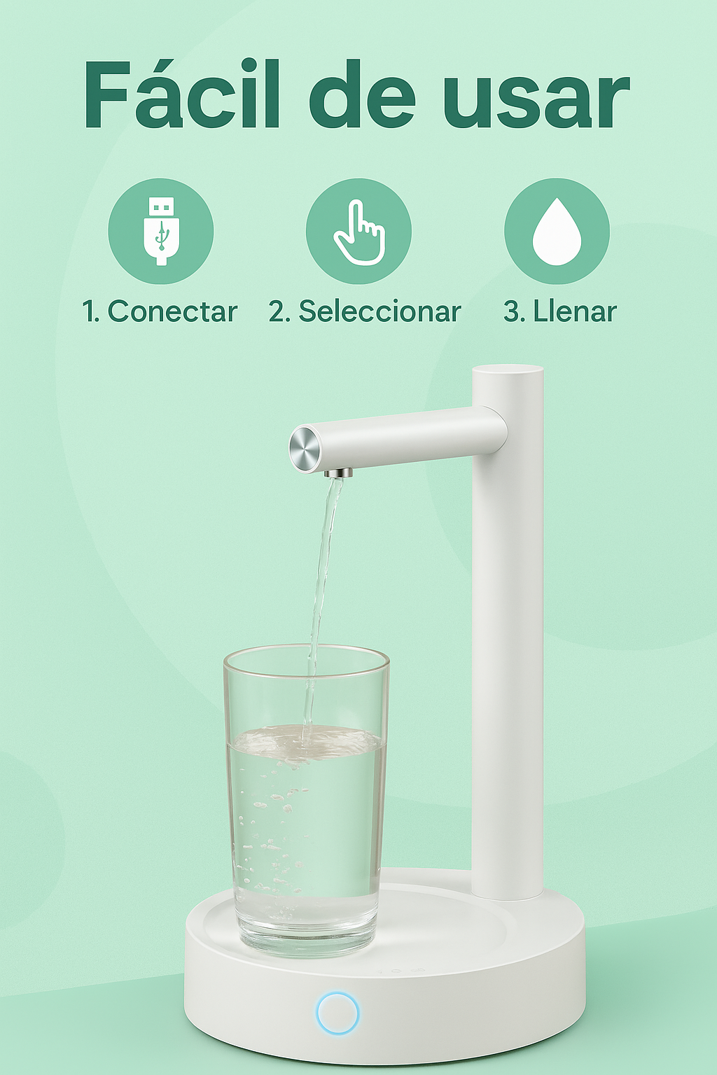 Solo debes conectar el tubo al garrafón, seleccionar la cantidad (100ml – 1000ml o flujo libre), presionar el botón LED… y el dispensador hará el resto.